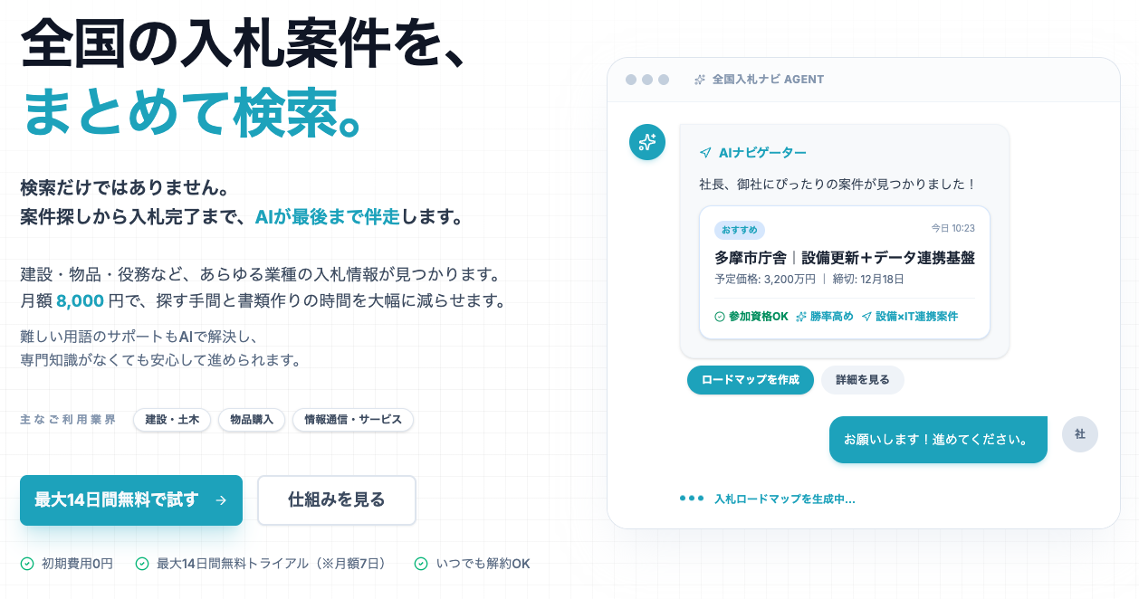 全国入札ナビは、単なる検索サイトではありません。「カーナビのように、ゴールまでの道順を案内する」をコンセプトに、案件探しから書類作成、締切管理まで、AIが専属エージェントとして最後まで伴走するサービスです。